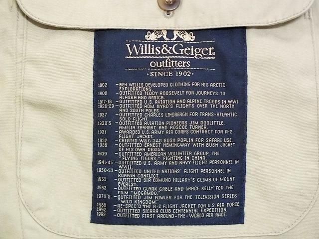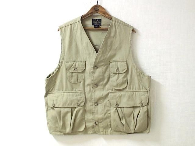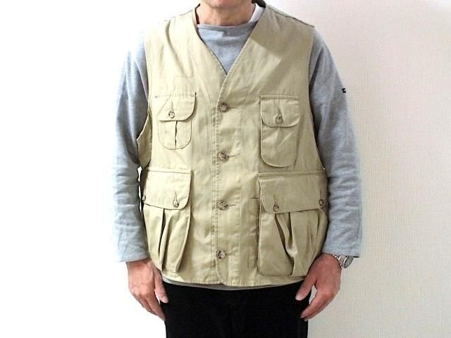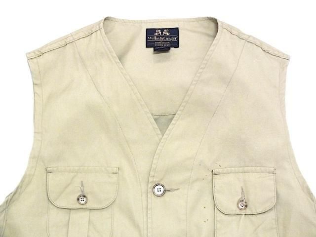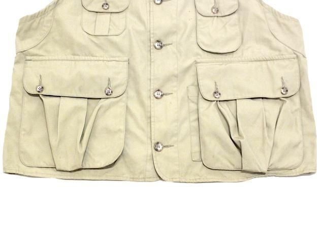 サイズ L (身幅61cm/ 着丈66cm/ 肩幅41cm) アメリカ製ウィリスアンドガイガー コットンブッシュ ポプリンベストです。 左胸にシミ汚れがあります。 お腹辺りにも薄汚れがありますが、まずまずの状態。 ウィリスアンドガイガーのブッシュポプリンは 世界中の探検家やアウトドアマンのニーズに応えるクオリティ。 4本の糸を撚り合わせた7.5オンスの生地は ハイツイストで目が細かく、丈夫で撥水性があり 摩擦にも強い高機能なファブリックです。 サイズ感、デザインが良くお好きな方は是非。 Color:Khaki 100% Cotton Made In U.S.A.