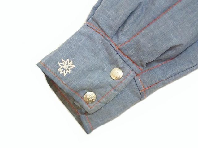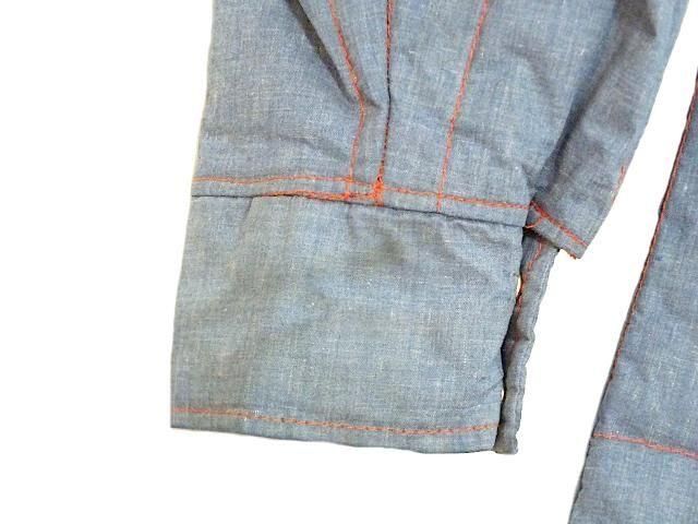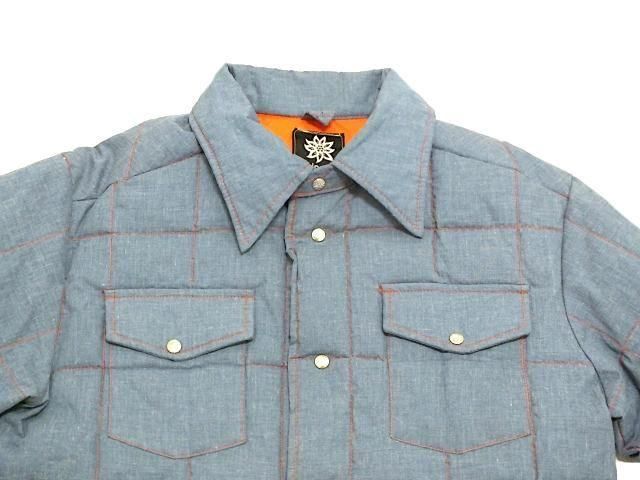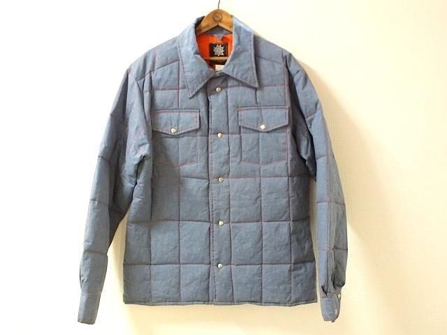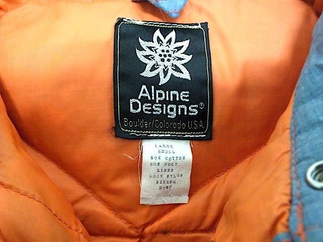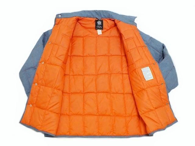 サイズ L (身幅58cm/ 袖丈68cm/ 着丈74cm/ 肩幅48cm) アルパインデザインズ コットンポリ ダウンシャツです。 袖口などに薄汚れがありますが 古着慣れしている方であれば問題無い程度です。 ダウンの抜けも気になりません。 カラーはブルーシャンブレーのような色合いで ステッチはオレンジ。 中間ウエアとしてもお勧めのダウンシャツです。 Shell:50% Cotton, 50% Polyester Liner:100% Nylon Fill:Down